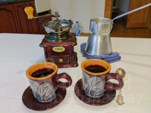 В доме есть все необходимое для приготовления еды и ее употребления: кастрюли, сковородки, тарелки, ложки, вилки, ножи, кружки, подс. масло, специи, соль, сахар, чай, кофе.