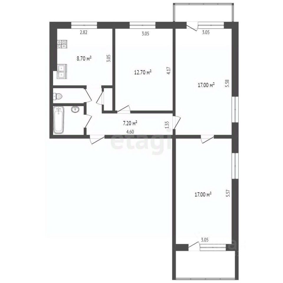 Комнаты правильной формы: 17м2, 17м2, 12.7м2