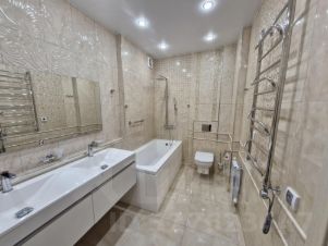 Планировка включает кухню-гостиную, мастер-спальню c просторным санузлом, кабинет с выходом на лоджию, второй санузел и холл. Энергосберегающие стеклопакеты REHAU. Покрытие полов паркетная доска и керамическая плитка KERAMA MARAZZI . Подогревы полов в санузлах. Стильные стеклянные матовые двери. Будущему владельцу остается кухонный гарнитур с встроенной бытовой техникой (посудомойка, духовой шкаф, вытяжка, стеклокерамическая варочная поверхность, микроволновая печь, холодильник) от ведущего европейского бренда ELECTROLUX, два кондиционера GENERAL CLIMATE. Мебель из массива (стол, стулья, подставка под ТВ, 2 горки, комод, шкаф) по договоренности. Сантехника премиальных европейских брендов.